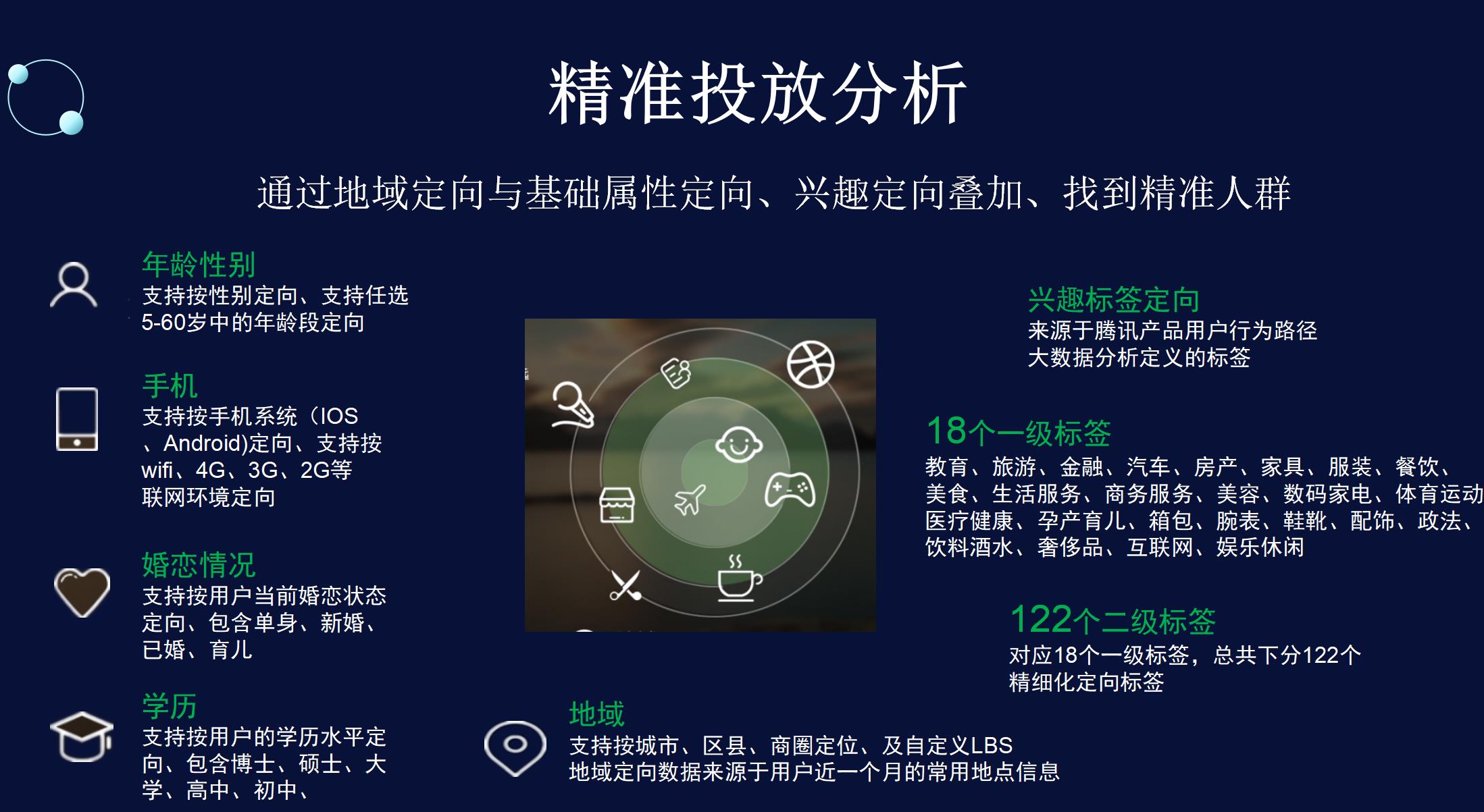 通过整合各腾讯产品用户行为路径的大数据,微信为每个用户进行了分析定义,并加上对应的标签。选择兴趣标签,有利于精准地找到目标用户,提高广告效果;标签选择越多,覆盖的用户越广。