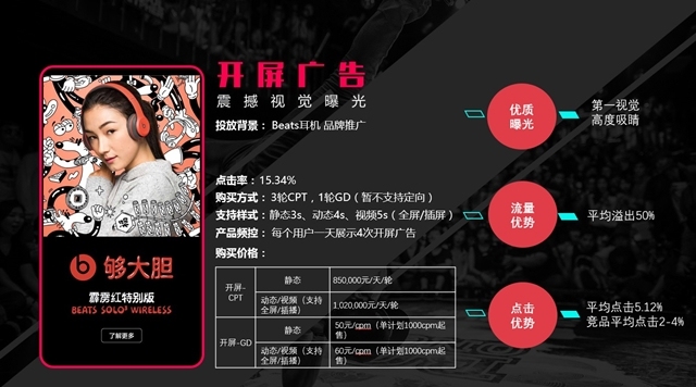 抖音开屏广告是用户启动抖音时的入口广告,视觉冲击强,可以第一时间吸引用户关注,不会受到其他信息的干扰,占据了时间与空间的优势,堪称黄金广告位。